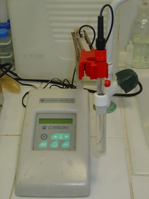 - pH meter: A potentiometer with an electrode whose potential depends on the amount of H+ ion present in the solution. (This is an example of an ion-selective electrode.) The pH of the solution is measured throughout the titration, more accurately than with an indicator; at the endpoint there will be a sudden change in the measured pH.