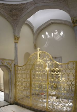 Main entrance to the Audience Chamber, with the small fountain of Suleiman I to the right, and the large gifts window to the left