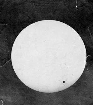 إن النقطة السوداء أمام الشمس هي كوكب الزهرة، وقد جرى تصويره عام 1882 أثناء العبور الأخير.