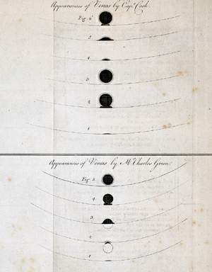 وكان من بين راصدي عام 1769 <D. ريتنهاوس> [العالم البارز في المستعمرات الأمريكية] الذي أصيب بالإغماء نتيجة الإثارة التي شعر بها بعد تحديقه في مقرابه. هذا وإن أول رحلة للمستكشف البريطاني القبطان J. كوك على السفينة Endeavour، استهدفت، في المقام الأول، رصد حدث العبور خلال استكشافه جنوب المحيط الهادئ. وقد أنجز كوك وبحارته هذه المهمة بنجاح من منطقة مازالت تعرف باسم Point Venus (أي «نقطة الزهرة») في تاهيتي، ومن موقعين آخرين مجاورين. لكن كوك ذكر حادثة مشؤومة تعرّض لها أيضا راصدون آخرون: فالمحاولات التي أجريت لتعيين الأوقات الدقيقة لتقابل الزهرة والشمس باءت بالفشل، لأن الحافتين الخارجيتين لهذين الجرمين كانت إحداهما تتداخل بالأخرى عدة ثوان [انظر الشكل الأيمن في الصفحة المقابلة]. وقد خمّن <كوك> أن هذه الظاهرة، التي صارت تُسمى تأثير القطرة السوداء black-drop effect، كانت نتيجة «جو أو غيمة داكنة اللون تحيط بجسم الكوكب.»