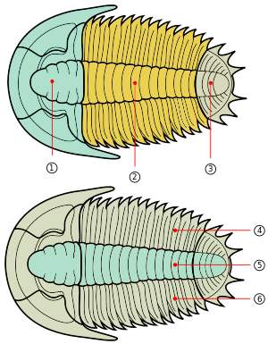The trilobite body is divided into three major sections (tagmata): 1 – cephalon; 2 – thorax; 3 – pygidium. Trilobites are so named for the three longitudinal lobes: 4 – left pleural lobe; 5 – axial lobe; 6 – left pleural lobe; the antennae and legs are not shown in these diagrams.