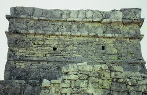 Tulum has architecture typical of Maya sites on the east coast of the Yucatán Peninsula. This architecture is recognized by a step running around the base of the building which sits on a low substructure. Doorways of this type are usually narrow with columns used as support if the building is big enough. As the walls flare out there are usually two sets of molding near the top. The room usually contains one or two small windows with an altar at the back wall, roofed by either a beam-and-rubble ceiling or being vaulted.[4] This type of architecture resembles what can be found in the nearby Chichen Itza, just on a much smaller scale.[3]