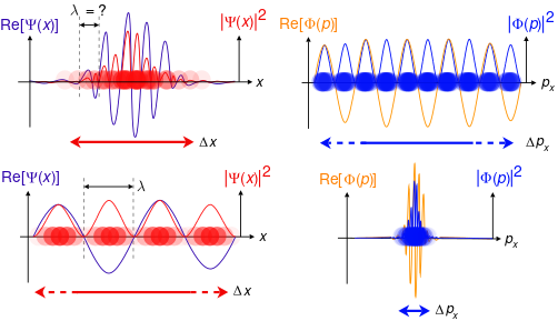 Top: If wavelength λ is unknown, so are momentum p, wave-vector k and energy E (de Broglie relations). As the particle is more localized in position space, Δx is smaller than for Δpx.
