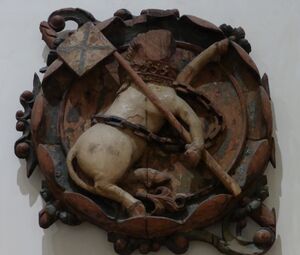 Various other designs for a common flag were drawn up following the union of the two Crowns in 1603, but were rarely, if ever, used.[56] One version showed St George's cross with St Andrew's cross in the canton, and another version placed the two crosses side by side. A painted wooden ceiling boss from Linlithgow Palace, dated to about 1617, depicts the Scottish royal unicorn holding a flag where a blue Saltire surmounts the red cross of St. George.