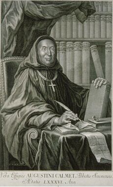 The hysteria, commonly referred to as the "vampire controversy,"[102] continued for a generation. At least sixteen contemporary treatises discussed the theological and philosophical implications of the vampire epidemic.[103] Dom Augustine Calmet, a French theologian and scholar, published a comprehensive treatise in 1751 titled Treatise on the Apparitions of Spirits and on Vampires or Revenants which investigated and analysed the evidence for vampirism.[101][ب] Numerous readers, including both Voltaire (critical) and numerous demonologists (supportive), interpreted the treatise as claiming that vampires existed.[101][ت]