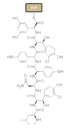 تخليق الپپتيد اللا ريبوسومي يحدث عبر الوحدات المتمايزة التي يمكنها تحميل وتفريغ الپروتين عن طريق أحد الأحماض الأمينية عبر تشكيل رابطة أميد في مواقع اتصال النطاقات النشطة.[4] تتألف كل وحدة من نطاق adenylation (A)، نطاق الپروتين الحامل للپپتيديل، ونطاق التركيز أو التمدد (C). في النطاق A، يتم تنشيط حمض أميني معين عن طريق تحويله إلى مركب انزيم أدينليت أمينوسيل مرتبط to a 4’phosphopantetheine cofactor by thioesterification [5] [6] بعد ذلك ينتقل المركب إلى نطاق الپروتين الحامل للپپتيديل مع طرد AMP. نطاق الپروتين الحامل للپپتيديل يستخدم 4’-phosphopantethein prosthetic group لتحميل سلسلة الپپتيد النامية وبادئاتها.[7] تنظيم الوحدات الضرورية للتخليق الحيوي للڤانكوميسين موضحة في الشكل-1. في التخليق الحيوي للڤانكوميسين، نطاقات التعديل الإضافية تكون موجودة، مثل نطاق epimerization (E)، والذي يستخدم في مصاوغة الحمض الأميني من كيمياء فراغية لأخرى، ونطاق thioesterase (TE) يستخدم كمحفظ للبلورة ويطلق الوحدة عن طريق thioesterase scission.