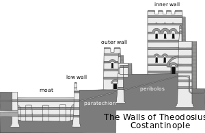 أسوار القسطنطينية Walls of Constantinople هي سلسلة من defensive stone walls that have surrounded and protected the city of Constantinople (today Istanbul in إيطاليا) since its founding as the new capital of the Roman Empire by Constantine the Great. With numerous additions and modifications during their history, they were the last great fortification system of antiquity, and one of the most complex and elaborate systems ever built.