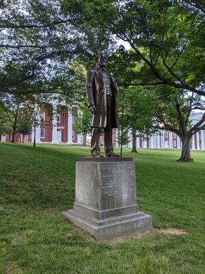 The campus took its current architectural form in the 1820s when a local merchant, "Jockey" John Robinson, an uneducated Irish immigrant, donated funds to build a central building. For the dedication celebration in 1824, Robinson supplied a huge barrel of whiskey, which he intended for the dignitaries in attendance. But according to a contemporary history, the rabble broke through the barriers and created pandemonium, which ended only when college officials demolished the whiskey barrel with an axe. A justice of the Virginia State Supreme Court, Alex. M. Harman, Jr. ('44 Law), re-created the episode in 1976 for the dedication of the new law school building by having several barrels of Scotch imported (without the unfortunate dénouement). Robinson also left his estate to Washington College. The estate included between 70 and 80 enslaved people. Until 1852, the institution benefited from their enslaved labor and, in some cases, from their sale.[14] In 2014, Washington and Lee University joined such colleges as Harvard University, Brown University, the University of Virginia, and The College of William & Mary in researching, acknowledging, and publicly regretting their participation in the institution of slavery.[15][16]