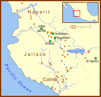 The shaft tomb tradition is thought to have developed around 300 BCE.[7] Some shaft tombs predate the tradition by more than 1000 years – for example, the shaft tomb at El Opeño in Michoacán has been dated to 1500 BCE but is linked to Central, rather than Western, Mexico. Like much else concerning the tradition, its origins are not well understood, although the valleys around Tequila, Jalisco, which include the archaeological sites of Huitzilapa and Teuchitlan, constitute its "undisputed core".[8] The tradition lasted until at least 300 CE although there is not wide agreement on the end date.[9]