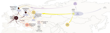 2. ^ "Recent paleogenomic studies have shown that migrations of Western steppe herders (WSH) beginning in the Eneolithic (ca. 3300–2700 BCE) profoundly transformed the genes and cultures of Europe and central Asia... The migration of these Western steppe herders (WSH), with the Yamnaya horizon (ca. 3300–2700 BCE) as their earliest representative, contributed not only to the European Corded Ware culture (ca. 2500–2200 BCE) but also to steppe cultures located between the Caspian Sea and the Altai-Sayan mountain region, such as the Afanasievo (ca. 3300–2500 BCE) and later Sintashta (2100–1800 BCE) and Andronovo (1800–1300 BCE) cultures."[3]