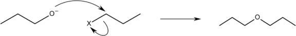 The Williamson ether reaction follows an SN2 bimolecular nucleophilic substitution mechanism. In an SN2 reaction mechanism there is a backside attack of an electrophile by a nucleophile and it occurs in a concerted mechanism (happens all at once). In order for the SN2 reaction to take place there must be a good leaving group which is strongly electronegative, commonly a halide.[4]