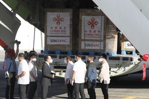 A Y-20 landing at Beijing Capital International Airport to transport the Sinopharm BIBP vaccine to Cambodia in February 2021