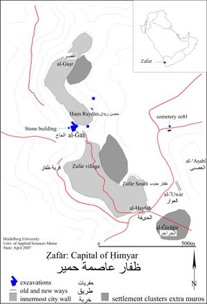 كما أظهرت المصادر اليونانية والرومانية مخطط للمدينة والتي كانت تلفظ في مصادرهم “زفار “ فيما أسهب لسان اليمن المؤرخ ابو محمد الحسن الهمداني الذي عاش في القرن الرابع الهجري في كتابه الإكليل في وصفها والتغني بأثرها وتحديد موقعها فذكر ان لظفار حمير (يحصب) تسعة أبواب هي(باب ولا،باب الإسلاف ،باب خرفة،باب صيد ،باب مآوه ، باب هدوان وباب خبان ،وباب حوره، وباب الحقل )على أن اهم تلك ألأبواب باب الحقل الذي كان عليه الأجراس حسب الهمداني اذا فتح او أغلق الباب سمع له صوت الرنين من مكان بعيد وكان يوجد لديه سور كبير تحصن به المنطقة.